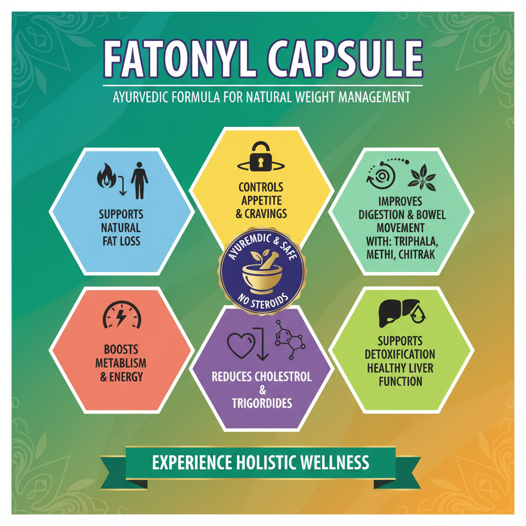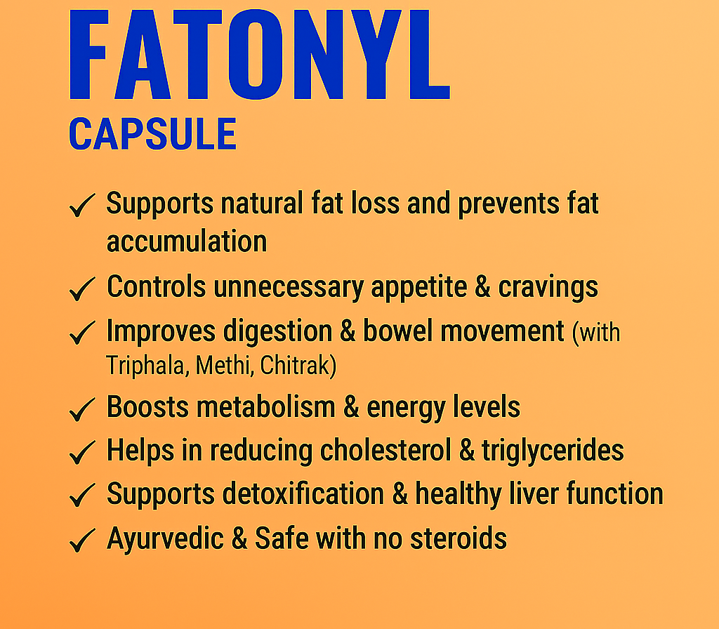 Zane Ayurveda का FATONYL कैप्सूल एक विशेष आयुर्वेदिक फॉर्मूला है, जिसे स्वस्थ वजन नियंत्रण और फैट मेटाबॉलिज्म के लिए तैयार किया गया है। इसमें गरसिनिया, ग्रीन टी, गुग्गुल, मेथी, कोकम, त्रिफला, दालचीनी, तुलसी, चित्रक, विदंग, त्रिकटु जैसे शक्तिशाली हर्ब्स शामिल हैं, जो अतिरिक्त चर्बी को जलाने, भूख पर नियंत्रण रखने, पाचन सुधारने और मेटाबॉलिज्म बढ़ाने में सहायक हैं।