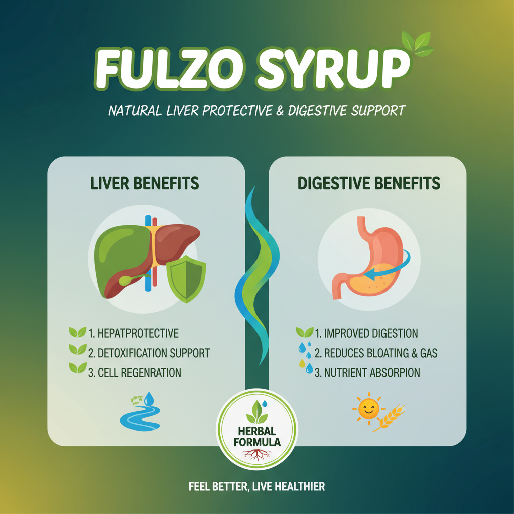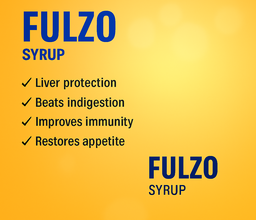 ZANE AYURVEDA — FULZO SYP एक पारंपरिक आयुर्वेदिक सिरप है, जिसे पाचन सुधारने और जिगर (लिवर) के संरक्षण के लिए तैयार किया गया है। प्रत्येक 10 ml में चुनी हुई जड़ी-बूटियों के जलीय अर्क हैं जो पाचन शक्ति बढ़ाने, अवशिष्ट विषों को निकालने और जिगर को सहारा देने में मदद करती हैं।