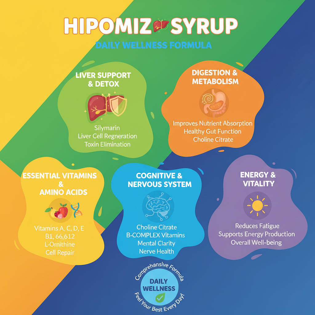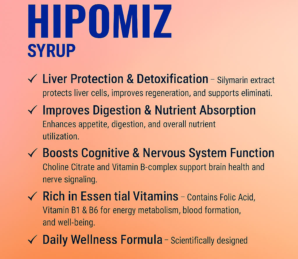 Hipomiz™ Suspension is a scientifically formulated liver-protective and detoxifying syrup enriched with Silymarin, Choline Citrate, Folic Acid, Vitamin B-complex (B1, B6), and L-Ornithine. This unique combination not only supports liver health but also helps in detoxification, digestion, cognitive function, and overall energy balance.