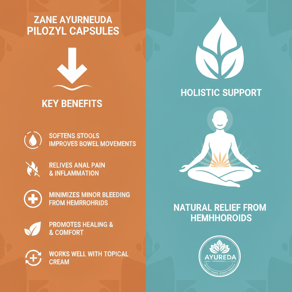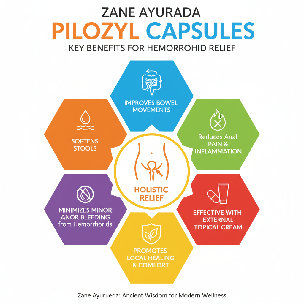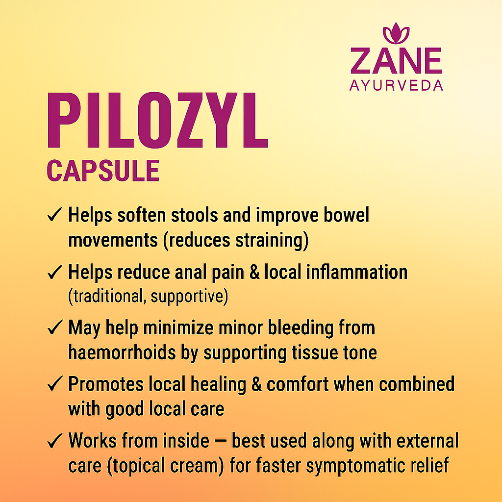 Herbal Ayurvedic formula for symptomatic support in piles (haemorrhoids) — helps reduce pain, inflammation & bleeding, softens stools and supports bowel regularity.Pilozyl is a classical Ayurvedic capsule blend designed to support bowel regularity, reduce anal inflammation and promote healing in piles — for faster relief combine with Zane Ayurveda Pilozyl Cream (topical) under medical supervision.